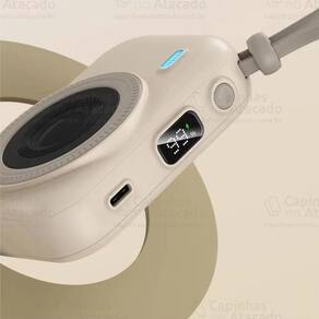 Power Bank compacto com design de minicâmera, 10000mAh de capacidade, carregamento rápido de até 22.5W, entrada Tipo-C, saídas Lightning e Tipo-C, carregamento por indução, visor LED indicador, proteção contra sobrecarga, descarga excessiva e curto-circuito.Tipo