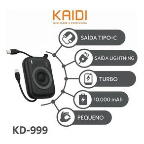 Power Bank compacto com design de minicâmera, capacidade de 10.000mAh, carregamento rápido de até 22.5W, entrada Tipo-C, duas saídas (Lightning e Tipo-C), proteção de múltiplos circuitos, visor LED indicador e chip de reconhecimento de tensão inteligente.Tipo