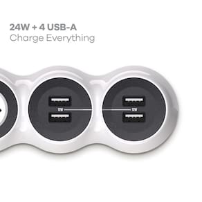 - 4 portas USB-A incluídas – O protetor contra sobretensão PowerCurve inclui quatro portas USB-A, facilitando a conexão e o carregamento de muitos dispositivos simultaneamente. Ótimo para espaços de trabalho ocupados, mesas de cabeceira, centros de entretenimento e muito mais.
