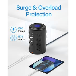 -?Estação de carregamento ultra-segura?O disjuntor embutido de 1875 watts e o protetor contra sobretensão de 1500 joules protegem seus aparelhos eletrônicos durante tropeços ou raios.
