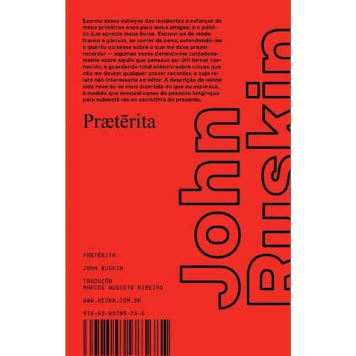John Ruskin (1819-1900), foi um dos mais importantes intelectuais da era vitoriana. Principal teórico da preservação arquitetônica e ambiental da Inglaterra do século XIX e crítico perspicaz das transformações sociais trazidas ao país pela industrialização, a qual veementemente combateu. Excêntrico, vinculado ao romantismo, grande esteta, valorizava a sensibilidade subjetiva em contraponto à razão; contraditório ao mesmo tempo aristocrático, reacionário e simpático ao socialismo. Pr te rita, sua autobiografia, foi sua última obra e testamento literário. Escrita ao longo de 27 anos, a desigualdade de suas partes reflete o estado mental do autor durante o período de sua elaboração. O livro, heterodoxo como gênero e de caráter experimental, não segue os modelos de autobiografias então vigentes geralmente apresentados em termos de confissão religiosa , e poderia também ser considerado como narrativa de viagem, elegia, memória filial ou coleção de excertos de diários. Esta tradução contempla apenas o primeiro dos três volumes de Pr te rita.