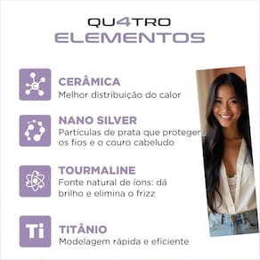 Seu | revestimento especial | com Qu4tro Elementos — Cerâmica, Titânio, Tourmaline e Nano Silver — é um verdadeiro diferencial. A cerâmica garante uma distribuição uniforme do calor, enquanto o titânio ajuda a reduzir o tempo de secagem e elimina o frizz. A tourmaline, com seus íons negativos, traz um brilho intenso e a proteção das partículas de Nano Silver inibe a ação de bactérias, garantindo um cuidado extra com os fios e couro cabeludo.