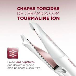 Alisa e Modela: A White Rose P-51 é sua prancha 2 em 1! Por ter um design diferenciado torcido, permite que, além de deixar os fios perfeitamente lisos, faça ondas ou cachos com facilidade. Além disso, possui revestimento cerâmico com Tourmaline Íon, tecnologia que cuida da saúde dos fios, reduzindo o frizz e dando brilho.
