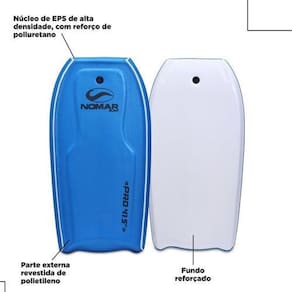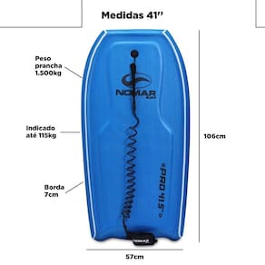 ESPECIFICAÇÕES: Prancha Pro-Bodyboard com Leash Marca Nomar Surf Shape Ultrabat Bloco Wave Core 2 stringers Rabeta Bat Tail Deck Ixlp liso Fundo HDPE Nose Bulbs Tamanho: 41.5 106 x 57 x 7 cm Peso aproximado do produto: 1,5 Kg Marca: Não Informado