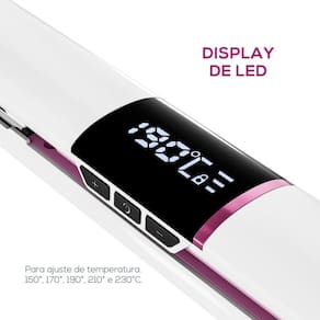 • Temperatura: mínima 150°C e máxima 230°C • Tipo de aquecimento: PTC • 5 temperaturas com Botão ON/OFF • Display digital • Luz indicadora de funcionamento • Display Placas flutuantes • Material do revestimento Titânio • Trava de fechamento • Ponta fria • Potência: 50W • Anel para pendurar • Cordão 360°emborrachado • Desligamento automático.