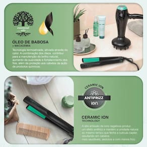 Atributos e Benefícios - Temperatura Máxima de 220°C: Alisa e modela com eficiência desde a raiz até as pontas, mesmo em cabelos mais resistentes. - Aquecimento Rápido: Fica pronta para o uso em segundos, agilizando sua rotina de cuidados. - Revestimento Ceramic Íon: Alta emissão de íons negativos que reduzem o frizz, aumentam o brilho e deixam os fios mais saudáveis e macios. - Tecnologia Essential Oils com Babosa: Libera nutrientes durante o uso, promovendo hidratação, brilho e proteção para todos os tipos de cabelo. - Bivolt Automático: Pode ser usada com segurança em tomadas 127V ou 220V, ideal para levar em viagens. - Placas de Cerâmica com Ponta Fria: Distribuem o calor uniformemente e oferecem mais segurança durante o manuseio. - Cabo Giratório de 2 Metros: Proporciona liberdade de movimento e mais conforto ao alisar ou modelar. - Função 2 em 1 – Alisa e Modela: Versátil para criar diferentes estilos, desde fios lisos até ondas e cachos leves. - Design Ergonômico e Leve: Facilita o uso contínuo sem cansar as mãos, ideal para o uso diário.