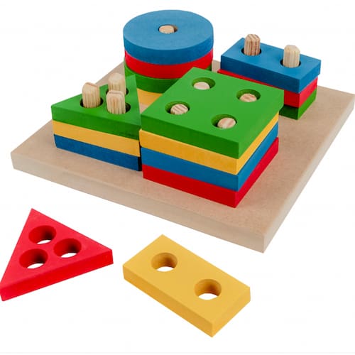 1 base medindo 19 x 20 x 7,5 cm, com pinos fixos de madeira e 16 peças geométricas coloridas, divididas em 4 formas (quadrado, retângulo, triângulo e círculos).