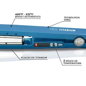 Revolucionam a maneira como o cabeleireiro faz progressivas, alisamentos e modelagens. Bivolt Automático e Floating Plates A prancha de cabelo Titanium azul vem com função de bivolt automático e combina placas ultra lisas com o sistema Floating Plates de amortecimento das placas durante a passada, dessa forma o profissional tem mais segurança e conforto na hora de ajustar as mechas. Placas de Titanium Ultra Lisas Conduz o calor ultra-alto uniformemente e resistem à corrosão, com a tecnologia mch que proporciona um aquecimento ultra rápido e recuperação imediata da temperatura. Principais Características Cabo giratório 3 metros Tecnologia Ionic antifrizz Placas Ultra Lisas de Titanium 32mm de largura Tecnologia mch reposição de calor imediata 5 níveis de temperatura chegando até 232ºC/450ºF Floating Plates permite acomodar a mecha nas placas sem que o profissional tensione o punho ou mão.
