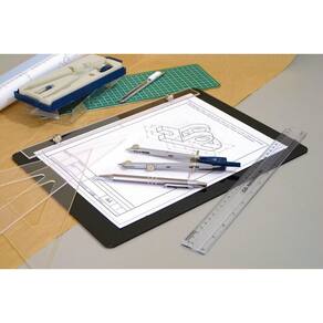 A prancheta inclusa no kit possui dimensões aproximadas de 25x35 cm e é feita de madeira resistente com acabamento superficial preto. Ela utiliza prendedores rosqueáveis para fixar a régua de acrílico, garantindo estabilidade durante o uso. Com uma espessura de 3mm, a prancheta é durável e ideal para uso frequente.