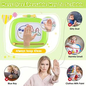 Quais habilidades as crianças podem aprender brincando com pranchetas magnéticas? Imaginação e criatividade As atividades criativas proporcionam às crianças imensa alegria e promovem a curiosidade e a resolução de problemas. Ao incentivar nossos filhos a brincar, explorar o ambiente e usar a imaginação, estamos plantando as sementes para o pensamento criativo e as habilidades de resolução de problemas. Habilidades motoras finas Com placas magnéticas, especialmente aquelas que vêm com lápis, são uma boa maneira de incentivar as crianças a usarem as mãos para criar algo incrível e legal. Sempre que uma criança usa as mãos e os dedos para brincar, ela está praticando e refinando suas habilidades motoras finas e a coordenação olho-mão. Habilidades de comunicação e linguagem Os quadros magnéticos incentivam as crianças a se envolverem em histórias criativas. Os blocos de desenho vêm com carimbos que eles podem usar para contar histórias com base em sua experiência ou em algo completamente novo de sua imaginação. Habilidades emocionais e sociais Quando as crianças brincam com placas magnéticas, elas podem se envolver em brincadeiras imaginativas e fingir. E enquanto jogam, eles podem experimentar emoções diferentes e terão a chance de ver as coisas em perspectivas diferentes. Ser capaz de contar histórias também ajuda a aumentar a confiança e a autoestima da criança. Pacote: 1 bloco de desenho, 4 pernas, 1 caneta — 🎀 1 presente para meninas de 2 anos: não é apenas um belo presente de Natal, presente de aniversário, presente de Natal, presentes de festivais, presente de visita para meninas, mas uma forma relativamente barata de oferecer a seu filho infinitas horas de oportunidades artísticas e educacionais. Use pranchetas magnéticas para matemática, reconhecimento de números, aprendizado de formas e até mesmo para fazer o dever de casa. - 🎨 Zonas de cores vermelho/azul/verde/amarelo: o quadro magnético de rabiscos para crianças de 1 a 3 anos exibe 4 cores diferentes que tornam o desenho infantil mais vívido. Com um doodle pad de 9,8", os brinquedos para meninas podem ser utilizados repetidamente. Sua filha de um ano pode facilmente puxar o escorregador para frente e para trás, então ele ficará limpo imediatamente. - 💪 Segurança e rolamento forte: a prancheta para crianças é feita de material ABS de alta qualidade, não tóxico e insípido, e passou no teste de segurança para brinquedos para bebês por mais de 12 meses, proporcionando às suas meninas uma infância segura e feliz. Até 120 libras. Não precisa se preocupar em tremer ou quebrar. - 🖍? Design suave e sem asfixia: não há peças pequenas sufocantes na embalagem para meninas de 18 meses ou mais. Design de borda fluida para evitar ferimentos nas mãos de uma menina de 1 ano. O design da caneta e da corda é integrado, não precisa se preocupar com a perda repentina da caneta. Comprimento de corda suficiente para permitir que a mão direita ou esquerda desenhe livremente. - 🎁 Brinquedos de viagem convenientes: as 4 pernas da mesa de desenho podem ser destacáveis e alteradas de formato de 3 maneiras. Deixe as crianças desenharem com mais liberdade e conforto. O design da alça é conveniente para transportar em viagens de carro, trem, barco e avião. Meninas de 1 a 3 anos não vão bagunçar o tapete da vovó da mesma forma que as tintas.