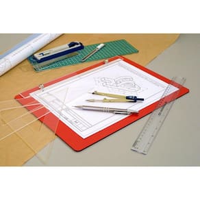 Prancheta em madeira tipo mdf com acabamento superficial vermelho medidas 35x25 cm aproximado. Indicadapara cursos de desenho técnico, engenharias, arquitetura, construção civil,entre outros. Possui prendedores rosqueáveis em metal e régua acrílica transparente.