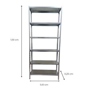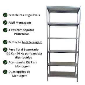 CARACTERISTICAS: *Fabricada em Chapa 0,50 mm *Peso máximo suportado 120 Kg - 20 Kg por bandeja distruibuídos *Proteção Anti Ferrugem *6 bandejas *Fácil Montagem *Acompanha Parafusos para montagem