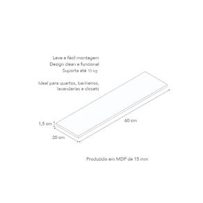 Contêm: 2 Prateleiras Suspensas Acompanha parafusos e buchas Dimensão montada: 60 x 20 x 1,5 cm Material: MDP 15mm de espessura Suporta até 10 kg cada prateleira Casacha é uma loja com atendimento exclusivo online, com artigos para casa, cozinha, banheiro e lavanderia.