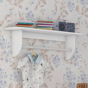 A Prateleira com Cabideiro Metálico é perfeita para complementar a organização do quarto do seu pequeno com praticidade e estilo. Produzida em MDF com pintura UV atóxica, conta com cantos e bordas arredondadas e laqueadas, oferecendo mais segurança no uso. O cabideiro metálico proporciona resistência para pendurar roupas e acessórios, enquanto a prateleira superior é ideal para objetos decorativos ou itens do dia a dia. Uma peça funcional, segura e charmosa para o ambiente infantil.