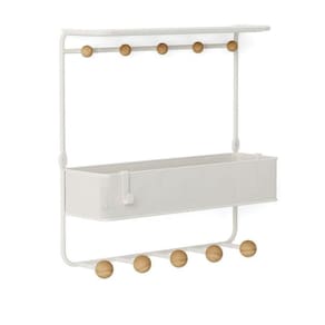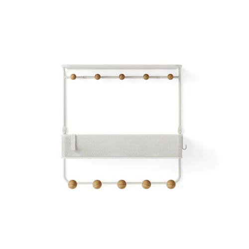 A Estique vem com cesta de metal perfurada, uma prateleira integrada no topo e dez cabides, oferecendo muito espaço para você guardar chaves, correspondências, jaquetas, bolsas e outros itens essenciais do dia a dia.