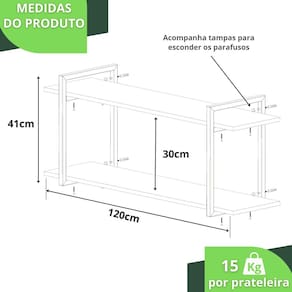 Ter um Banheiro organizado traz leveza e praticidade para sua rotina, para que ele fique em ordem, é necessário o uso de alguns produtos. O nicho granada de parede é indispensável, além de dar um toque especial na decoração.   Produzido em aço com camada anti-ferrugem de fosfatização e pintura eletrostática epóxi, com prateleiras de MDP de primeira qualidade. Acompanha tampões projetados exclusivamente para esconder as cabeças dos parafusos de fixação na mesma cor dos arcos.   ESPECIFICAÇÕES TÉCNICAS Área de instalação: Quartos, Salas de Jantar, Cozinhas, Banheiros Material: Aço e MDPDimensões do tubo da estrutura: Tubo quadrado 20x20 mmAcabamento da Estrutura de aço: BrancoAcabamento do MDP: Preto MEDIDAS DO NICHOComprimento: 120cmAltura: 41cmProfundidade: 29cmDistância entre as prateleiras: 30cm MEDIDAS DA PLACA DE MDPComprimento: 120cmEspessura: 1.5cmProfundidade: 24.5cm  Tipo de Fixação: Parafusos Quantidade de Fixação: 4 Parafusos kit de parafusos e buchas para instalação: SIM