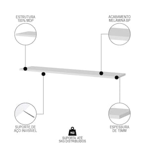 O Kit de Prateleiras para sala tem diversas utilidades! Por exemplo, além de organizar o ambiente, ela também agrega na decoração. A prateleira pode ser enfeitada com itens como livros, velas, esculturas, ou vasos de plantas e trazendo mais dinamismo ao espaço. A Prateleira de Madeira é produzida 100% MDP, e um acabamento em melamina BP, que protege contra riscos e manchas. A prateleira tem 15mm de espessura. A fita de borda confere um acabamento refinado e evita que as bordas se descolem ou lasquem com facilidade. E fica a sua escolha instalar o kit de prateleiras junto ou separar, deixando alinhadas ou alternadas. São várias formas de usar, as prateleiras são modernas e descontraídas ideal para todos os ambientes. Aah! E o melhor de tudo, cada prateleira acompanha 2 Suportes Invisíveis em aço já com as buchas 8mm, que ficam escondidos atrás da prateleira e cria um efeito flutuante, eles permitem uma instalação fácil e segura, e sem furos ou parafusos aparentes.
