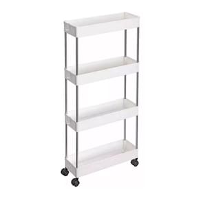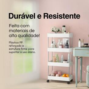 - Cor: branca com hastes em inox e rodas brancas.Prateleira Multiuso 4 Andares com Rodinha Branca