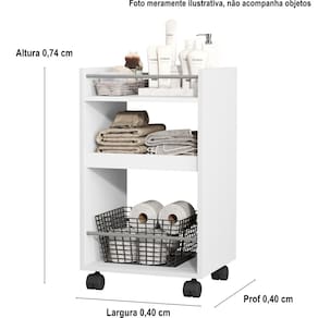 Prateleira multiuso organizador amon cor branco - comprar moveis para sua casa Prateleira multiuso amon, criada para inovar na organização do seu ambiente. Produto exclusivo comprar móveis em casa para deixar seu ambiente mais bonito e sofisticado procure nossas redes sociais e confira todos nossos produtos e qualidade de atendimento : Produto com video de montagem no nosso canal, acesse nossas redes sociais: comprar móveis em casa Dimensões do produto montado Altura: 0,74 cm largura: 0,40 cm profundidade: 0,40 cm Caractersticas: Mdp 12mm 4 rodizios 4 hastes plasticas Produto não acompanha cesta e objetos, foto meramente ilustrativa Montagem: Este produto acompanha kit de montagem + manual de instrução detalhando passo a passo de como montar. A montagem do produto deverá ser feita por um , para que não ocorram danos no produto. não nos responsabilizamos por erro de montagem Atenção: a montagem não é oferecida pela comprar móveis em casa, a montagem do produto é por conta do comprador. Observações importantes: A é de 90 dias por defeitos de fabricação. Se no ato de recebimento do produto o cliente verificar que o produto não está em prefeito estado, principalmente por ocasião de transporte irregular, o cliente deverá recusar o recebimento do produto e entrar em contato para resolver o problema. Podem haver variações referentes à tonalidade das cores expressas nas fotos, por conta de fatores como iluminação e brilho de cada monitor/celular. Fotos meramente ilustrativas, não acompanham os produtos de decoração. Atenção, se atente a politica de troca/devolução da empresa. Marca: Não Informado