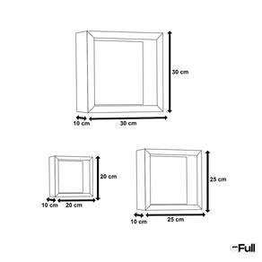 Com dimensões de 30cm de largura, 30cm de altura e 10cm de profundidade, 25cm de largura, 25cm de altura e 10cm de profundidade e 20cm de largura, 20cm de altura e 10cm de profundidade estas prateleiras são dimensionadas perfeitamente para acomodar e oferecer espaço suficiente para seus objetos de decoração servindo quase como uma estante.