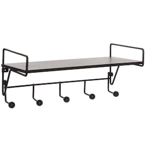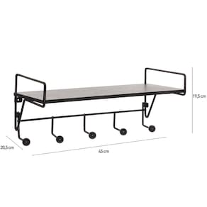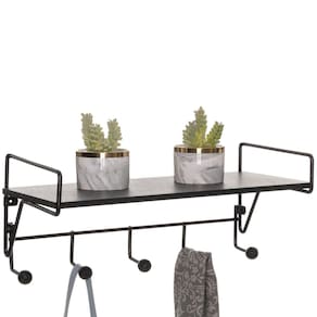Descrição Prateleira Organizadora com Ganchos Prateleira com ganchos em madeira MDP com estrutura em aço e pintura eletrostática multifuncional para sala de estar, sala de jantar, quarto, cozinha e qualquer ambiente, ideal para organização e decoração da casa