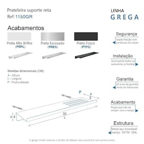 A prateleira suporte reta da linha Grega possui um design moderno e sofisticado, é uma peça que se destaca com requinte. Ela decora e adiciona personalidade. Podem ser utilizadas em banheiros, decoração de parede, cozinhas, quartos e muito mais. Aproveita o espaço vertical das paredes liberando espaço no chão, assim criando a sensação de um ambiente maior. São peças que fazem realçar qualquer objeto, foi criada Em aço inox com uma qualidade que abrange áreas litorâneas, e possui a de um acabamento muito resistente. Agora é só você adquirir este lindo acessório e fazer o seu projeto se tornar realidade com um banheiro prático para toda a sua família. Características Fabricado em metal aço inox. Disponível no Prata Alto Brilho, Escovado e Preto Fosco. Pode ser instalado em parede, azulejo e porcelanato. Benefícios Fixação prática e segura com parafusos e buchas inclusos. O produto não possui nenhum detalhe em plástico ABS . Fácil higienização, ideal para locais que exigem limpeza constante. Aproveitamento inteligente do espaço, ideal para ambientes compactos. Resistente à corrosão e luz solar. Itens ENVIADOS: 1 prateleira suporte reta 30cm, kit de parafusos e manual instrução instalação. Instalação INTELIGENTE Ao 1º furo, use uma broca medida menor, após use a medida correta e finalize, vai ajudar na precisão da fixação da bucha principalmente em azulejos e porcelanato. Marca: Não Informado
