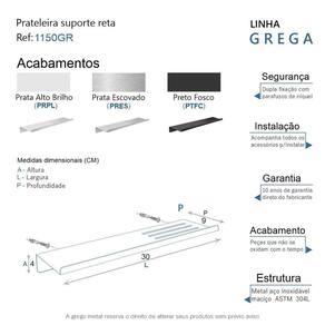A prateleira suporte reta da linha Grega possui um design moderno e sofisticado, é uma peça que se destaca com requinte. Ela decora e adiciona personalidade. Podem ser utilizadas em banheiros, decoração de parede, cozinhas, quartos e muito mais. Aproveita o espaço vertical das paredes liberando espaço no chão, assim criando a sensação de um ambiente maior. São peças que fazem realçar qualquer objeto, foi criada Em aço inox com uma qualidade que abrange áreas litorâneas, e possui a de um acabamento muito resistente. Agora é só você adquirir este lindo acessório e fazer o seu projeto se tornar realidade com um banheiro prático para toda a sua família. Características Fabricado em metal aço inox. Disponível no Prata Alto Brilho, Escovado e Preto Fosco. Pode ser instalado em parede, azulejo e porcelanato. Benefícios Fixação prática e segura com parafusos e buchas inclusos. O produto não possui nenhum detalhe em plástico ABS . Fácil higienização, ideal para locais que exigem limpeza constante. Aproveitamento inteligente do espaço, ideal para ambientes compactos. Resistente à corrosão e luz solar. Itens ENVIADOS: 1 prateleira suporte reta 30cm, kit de parafusos e manual instrução instalação. Instalação INTELIGENTE Ao 1º furo, use uma broca medida menor, após use a medida correta e finalize, vai ajudar na precisão da fixação da bucha principalmente em azulejos e porcelanato. Marca: Não Informado