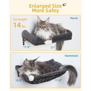 - 1. Conforto perfeito para grandes bolas de pelúcia projetadas para Maine Coons, Ragdolls, estas prateleiras de parede para gatos apresentam um poleiro de pelúcia preenchido com algodão de 43 x 30 cm, uma rede aconchegante de 44 x 27 cm e uma plataforma de 30 cm de largura — até mesmo gatinhos king-size merecem um trono