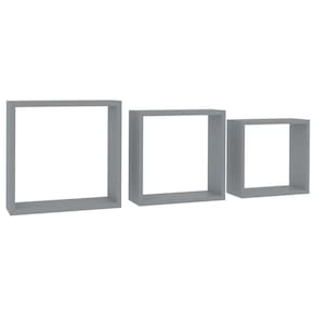 - Cor: cinza- - Material: MDF- - Dimensões da prateleira de cubos grandes: 11,8" x 3,9" x 11,8" (L x P x A) - - Dimensões da prateleira de cubos médios: 10,6" x 3,9" x 10,6" (L x P x A) - - Dimensões da prateleira de cubos pequenos: 9,4 “x 3,9" x 9,4" (L x P x A) - - Capacidade máxima de carga (cada): 11 lb- - Sistema de montagem invisível- - Montagem necessária: Sim- - A entrega contém: - - 3 x Prateleira- - Proposta 65 da Califórnia