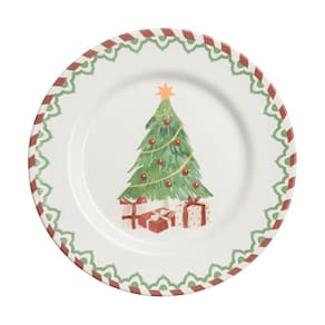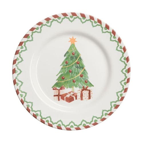 O prato de Sobremesa Natal Tree Gifts possui 21 cm de diâmetro é confeccionado em cerâmica. Se conecta com uma decoração tradicional. Apresenta uma árvore de Natal decorada no centro, adornada com enfeites coloridos e uma estrela no topo, adicionando um toque festivo alegre. A borda possui uma estampa em zigue-zague lembrando bengalas doces que complementa o design natalino.