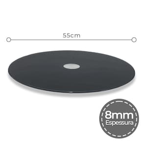 Prato Giratório 55Cm De Vidro Temperado 8Mm Cor Preto - vidro temperado 8mm 5 à 7x mais resistente do que o vidro comum; - muito mais resistente à variações de temperatura de até 250ºc panelas etc... - base giratório reforçada e blindada oferece giro livre e macio sem trancos; - prato inferior garante a maior estabilidade 'não tomba'; - qualidade high-premium "foi feito para durar"; - suporta em sua base até 100kg; - corte à laser "sem rebarbas", acabamento perfeito c/borda infinita; - vidro temperado é considerado como "vidro de segurança" não estilhaça ; - sucesso absoluto, quem utiliza aprova e recomenda Atenção Nosso maior compromisso é a qualidade e segurança, fique atento à economizar comprando prato giratório pelo menor preço. Com segurança não se brinca, existem pratos no mercado que estão descolando à mesa, isso pode transformar um momento familiar no maior pesadelo. Muitas vezes o barato sai caro. Exija qualidade para sua total segurança. Dica: decorativo e funcional, pode ser utilizado também como centro de mesa. Dica extra: pode ser utilizado para exposição de produtos em lojas, é ótimo para confeitar bolos. Cuidados: Utilize detergente neutro e enxágue com água em abundância. Para secar utilize pano seco e macio. Utilize esponja macia e não abrasiva. Características: Altura: 2cm Diâmetro: 55cm Espessura do vidro: 8mm Cor: preto Material: vidro e rolamento de alumínio Conteúdo: 1 x prato giratório preto 55cm