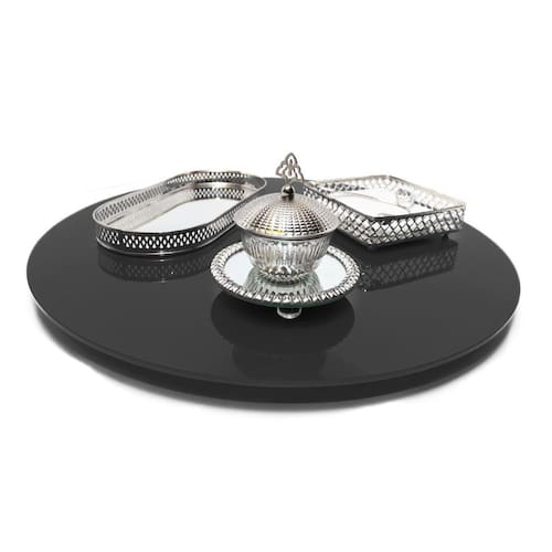Prato Giratório 55Cm De Vidro Temperado 8Mm Cor Preto - vidro temperado 8mm 5 à 7x mais resistente do que o vidro comum; - muito mais resistente à variações de temperatura de até 250ºc panelas etc... - base giratório reforçada e blindada oferece giro livre e macio sem trancos; - prato inferior garante a maior estabilidade 'não tomba'; - qualidade high-premium "foi feito para durar"; - suporta em sua base até 100kg; - corte à laser "sem rebarbas", acabamento perfeito c/borda infinita; - vidro temperado é considerado como "vidro de segurança" não estilhaça ; - sucesso absoluto, quem utiliza aprova e recomenda Atenção Nosso maior compromisso é a qualidade e segurança, fique atento à economizar comprando prato giratório pelo menor preço. Com segurança não se brinca, existem pratos no mercado que estão descolando à mesa, isso pode transformar um momento familiar no maior pesadelo. Muitas vezes o barato sai caro. Exija qualidade para sua total segurança. Dica: decorativo e funcional, pode ser utilizado também como centro de mesa. Dica extra: pode ser utilizado para exposição de produtos em lojas, é ótimo para confeitar bolos. Cuidados: Utilize detergente neutro e enxágue com água em abundância. Para secar utilize pano seco e macio. Utilize esponja macia e não abrasiva. Características: Altura: 2cm Diâmetro: 55cm Espessura do vidro: 8mm Cor: preto Material: vidro e rolamento de alumínio Conteúdo: 1 x prato giratório preto 55cm