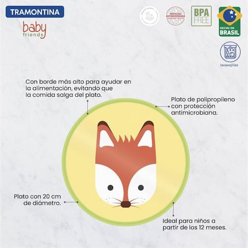 Prato Infantil Tramontina Baby Friends Em Polipropileno Verde Prato Infantil Tramontina Baby Friends em Polipropileno Verde O prato infantil Tramontina Baby Friends em polipropileno verde vai tornar a refeição do seu bebê muito mais colorida e estimular os sentindos dos pequenos durante a refeição. Ele é produzido em polipropileno e conta com borda alta que auxilia durante a alimentação, característica que evita sujeira e desperdícios. Para proporcionar a para seu bebê, ele possui proteção antimicrobiana que inibe o crescimento de fungos e bactérias, proporcionando benefícios em higiene e redução de microorganismos que causam contaminação. É a Tramontina, pensando em toda a sua família!