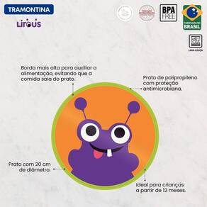 Com o prato infantil Tramontina Lirous em polipropileno verde você vai estimular as crianças durante a refeição e deixá-la muito mais colorida. Desenvolvido em polipropileno, ele conta com proteção antimicrobiana que inibe o crescimento de bacterias e fungos, deixando a alimentação mais segura e livre de contamição. O prato ainda possui borda alta e vai garantir uma alimentação com menos bagunça e sujeira, além de evitar desperdício! Orientações Prato de polipropileno com borda mais alta para auxiliar a alimentação, evitando que a comida saia do prato. Produto com proteção antimicrobiana que inibe o crescimento de fungos e bactérias, proporcionando benefícios em higiene e redução de microorganismos que causam contaminação.Pode ir a máquina de lavar louças, facitando a limpeza. Produto Livre de BPA: O Bisfenol-A é um componente químico usado na produção de alguns plásticos como o Policarbonato. Este componente pode ser prejudicial à saúde e por isso a Tramontina não o utiliza em seus produtos. Características Gerais EAN13 7891112299405 DUN14 17891112299402 NCM 3924.10.00 Peso Líquido 0,0900 kg. Peso Bruto 0,1300 kg. Metragem 0,000881 m³. Dimensões Embalagem (Compr. X Larg. X Alt.) 233x 14x 270 mm. Dimensões Produto (Compr. X Larg. X Alt.) 200x 200x 13 mm. Diâmetro 20,0 cm. Cor 1 D0DF00 Hexa Observações Recomenda-se o uso deste produto para crianças com 12 meses ou mais. Antes da primeira utilização, lave bem a peça e seque-a. Este produto pode ir à máquina de lavar, porém não recomendamos usar produtos abrasivos como saponáceos, esponjas rígidas ou palhas de aço. Seque-o bem antes de guardar. O prato pode ser usado no micro-ondas para aquecimentos breves de, no máximo, 3 minutos. Para descarte do produto e embalagem siga as orientações de reciclagem vigentes.Atenção: Por razões de segurança e saúde do seu filho, utilizar sempre os produtos com supervisão de um adulto. Não utilize os produtos caso apresentarem dano ou defeito. Verifique sempre a temperatura do alimento antes da alimentação.