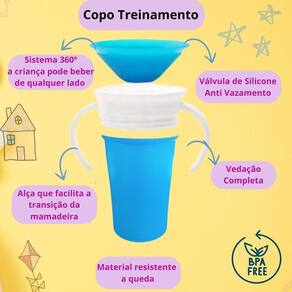 Este copo 360 º antivazamento, prático, moderno e seguro para seu pequeno tomar o suco, leite ou água sem derramar pela casa toda. O copo foi desenvolvido sem bico, com a finalidade de não vazar, ideal para os pequeninos que estão na fase de introdução alimentar. Possui alças para facilitar o uso. Seu bebê pode tomar o líquido em qualquer lado da borda do copo com uma sucção suave, pois ele tem abertura 360 toda protegida por silicone antivazamento.