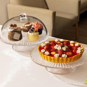 Com um diâmetro de 29 cm e altura total de 22 cm, este prato com pé oferece a altura ideal para que suas criações culinárias sejam o centro das atenções. A tampa de cristal protege o conteúdo, mantendo a frescura e o sabor, enquanto permite uma visão clara da iguaria que se encontra por baixo.