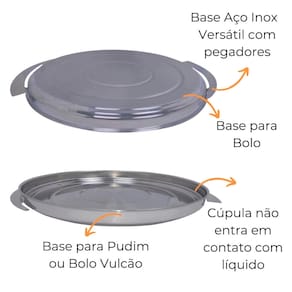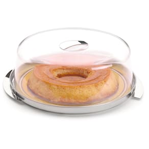 O prato/base é muito versátil e possui dois pegadores para facilitar o seu transporte, já a cúpula tem seu puxador em aço inox o que dá mais higiêne e glamour ao produto.