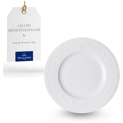 Este produto pode ser lavado na máquina de lavar louça e utilizado no micro-ondas. Feito de porcelana premium de alta qualidade, produzida na Alemanha, o pacote inclui 1 prato de café da manhã Villeroy & Boch Cellini, medindo 22 cm, na cor branca.