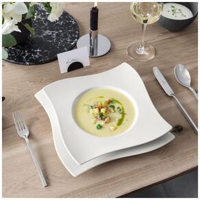 Apresentamos o moderno prato de sopa da linha NewWave da Villeroy Boch, feito em porcelana premium. Com seu design curvo, este prato traz elegância e sofisticação ao servir sopas e ensopados deliciosos. Sua profundidade ideal permite acomodar ingredientes como massas e carnes com facilidade, enquanto a borda larga evita que derramamentos ocorram ao servir.