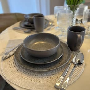 Elegância Duradoura: Com inspiração natural, o acabamento acetinado em cinza, combinado com detalhes em preto, lembra a superfície de uma pedra mineral como o granito, adicionando um toque refinado à mesa.