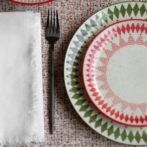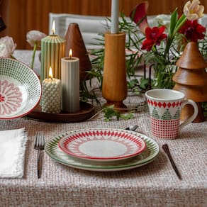 Descrição Uma coleção onde a magia do circo encontra o encanto do Natal. A vibrante atmosfera circense ganha vida em cada peça, trazendo cores contrastantes inspiradas nos tons clássicos da época, verde e vermelho. A alegria e a extravagância do circo se unem ao espírito festivo da temporada, criando uma mistura única e encantadora. Elementos marcantes como o pinheirinho e as bengalas de alcaçuz ganham destaque, trazendo um toque lúdico e cheio de charme à sua mesa. O prato de sobremesa possui 20 cm de diâmetro.