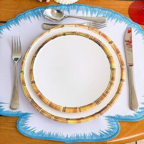 A parte central branca do prato cria um fundo neutro e elegante, enquanto a borda de bambu adiciona um toque de rusticidade e charme. Essa combinação de materiais e texturas cria um equilíbrio harmonioso entre o moderno e o natural, tornando o prato perfeito para uma variedade de ocasiões.
