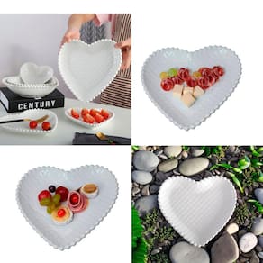 Prato Petiscos Design de Coração Branco 24,5x22,5CM Superfície Cravejada de Corações Ideal para deixar sua mesa posta requintada e elegante.