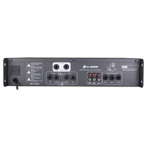 Saídas: 1 saída auxiliar line out com 2 conectores rca mono 1 saídas output com 2 conectores p10 e volume master 2 caixas de 8 ohms 140 w rms 1 caixa de 4 ohms 250 w rms