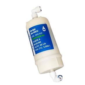 Pré Filtro Purificador Água Alcalina Classe A Universal Mangueira 1/4 Pré Filtro Refil DV-BAC compatível com todos os purificadores de água que usam mangueira de 1/4. Refil capaz de deixar a água alcalina, elevando o pH, além de ter uma super filtração, com retenção de partículas classe A, retendo as partículas mais difíceis, além de reduzir o cloro presente na água. O filtro tem encaixe para mangueira de 1/4, portanto pode ser instalado em qualquer outro modelo de purificador de água que tenha mangueira de 1/4 também, sendo facilmente adaptado para trazer ultra-filtração e água alcalina. Algumas marcas de purificadores que usam mangueira de 1/4 e são compatíveis: Electrolux, Consul, IBBL, Masterfrio, Geladeira Side by Side, Newup, Europa, Bebedouro , entre outros. Fazer a instação do filtro é muito simples. Cada refil deve ser trocado a cada 12 meses, ou antes, caso estime que seja consumido 3000 litros em menos de 12 meses. As marcas e produtos citados e ilustrados são propriedades de seus respectivos fabricantes e aparecem apenas para demonstrar a compatibilidade deste produto. --------------------------------------------------------------------------- Marca: Acquabios Eficiência da retenção de partículas: Classe A Eficiência da redução de Cloro livre: Aprovado SUPER PURIFICAÇÃO PH+ Alcalino Composição: Polipropileno + Carvão Ativado e minerais produto de acordo com a norma ABNT NBT 16098:2012. Elemento filtrando destinado ao uso em água que atenda a portaria N 2.914 do Ministério da Saúde.