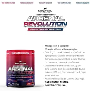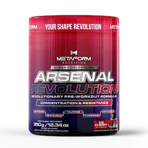 Pré Treino Arsenal Revolution 350g Metaform Nutrition Sabor: Ice Cherry O Pré-treino Arsenal Revolution da Metaform Nutrition é uma fórmula desenvolvida para apoiar o desempenho físico durante os treinos. Cada porção de 7g contém ingredientes como Beta-Alanina, L-Arginina e Cafeína, que podem contribuir para aumentar a energia, o foco e a resistência.