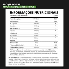 Você terá mais energia, com sua nova composição, tanto no sabor e na sua fórmula, ajudara dar aquele pump esperado. Ira manter a intensidade total do início até o fim, com a nova tecnologia gradual de energia. Prohibido traz foco e concentração, necessários para os treinos. Além disso, tem propriedades que protegem o sistema circulatório e coração, trazendo bemestar. Maça verde: a refrescância e leveza dos cítricos, antes do seu treino. COMPOSIÇÃO: Arginina: A arginina é um aminoácido condicionalmente essencial, ela é importante para o fluxo sanguíneo e níveis de óxido nítrico no corpo, mas a suplementação oral é ineficaz em aumentar o fluxo sanguíneo na maioria dos casos. Arginina reduz o custo de oxigênio do exercício e isso aumenta o tempo para exaustão. Creatina: A creatina é uma substância formada a partir da arginina, glicina e metionina, sendo uma molécula produzida pelo corpo e encontrada em boa quantidade em comidas como carne, ovos e peixes. O seu corpo sintetiza cerca de um grama de creatina por dia. Ela está presente em quase todas as células e age como uma reserva de energia, acelerando o processo no qual a energia celular (ATP) é gerada. Isso aumenta a capacidade de trabalho das células. Taurina: A taurina é um aminoácido nãoessencial encontrado em alimentos, principalmente carnes. Como todo aminoácido, ela tem inúmeros papéis no organismo, e apesar de não estar envolvida na síntese de proteína muscular, tem um papel crucial na capacidade de contração do músculo e ajuda e prevenir cãibras. Lcarnitina: A carnitina é sintetizada a partir dos aminoácidos lisina e metionina e é encontrada em carnes e laticínios. No corpo, ela é encontrada primariamente no tecido muscular esquelético. Sua principal função é transportar ácidos graxos para a mitocôndria para serem oxidados. Aumento da resistência a fadiga e prevenção da acidose muscular. Ltirosina: A tirosina é um aminoácido usado para produzir noradrenalina, adrenalina e dopamina no cérebro, sua suplementação pode ser usada para diminuir o estresse, entre outras coisas. A tirosina pode ter um efeito positivo por reduzir a perda de memória induzida pelo estresse causado pelo frio. O estresse agudo é capaz de esgotar as concentrações de noradrenalina no tecido neural, particularmente no hipotálamo e tronco cerebral. A ingestão de tirosina se mostrou eficaz em atenuar o desenvolvimento dessas anormalidades comportamentais. Palatinose: A palatinose, que também pode ser chamada de isomaltulose, é um carboidrato totalmente digerível formado por glicose e frutose, ou seja, uma sacarose. Para o o seu uso é interessante, pois ela tem a capacidade de reduzir a fome e a necessidade do consumo de açúcar, pois fornece glicose de maneira mais equilibrada, evitando picos glicêmicos e insulinêmicos. Também promove a oxidação de gordura, ou seja, permite maior utilização da gordura corporal e de ácidos graxos como fontes de energia durante a atividade física. INGREDIENTES Citrus:larginina, Creatina Monohidratada, Palatinose(tm) (Isomaltulose), Taurina, LAlanina, LTirosina, LCarnitina, Cafeína Anidra, Piridoxina (Vitamina B6), Ácido Nicotínico (Vitamina B3), Picolinato de cromo, Acidulante: ácido citrico, aroma idêntico ao natural de frutas cítricas, edulcorante sucralose, antiumectante dióxido de silício, corante amarelo crepúsculo e corante vermelho allura. SUGESTÃO DE USO Adicione 3 medidores (15 g) em 300 ml de água e agite bem. Acompanha camiseta da 3VS NUTRITION somente no tamanho M. ANVISA: Registro ISENTO conforme resolução RDC 27 de 06 de agosto de 2010 anexo I.