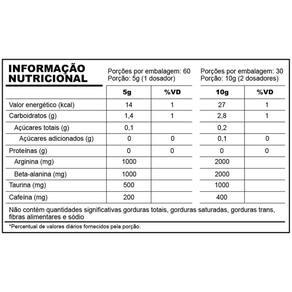 Ingredientes: Cloridrato De L-Arginina, Beta-Alanina, Maltodextrina, Taurina, Beterraba Em Pó, Melancia Em Pó, Cafeína, Extrato De Laranja Amarga, Acidulante Ácido Cítrico, Antiumectante Dióxido De Silício E Fosfato Tricálcico, Aromatizante Idêntico Ao Natural, Edulcorante Sucralose E Acessulfame De Potássio, Corante.