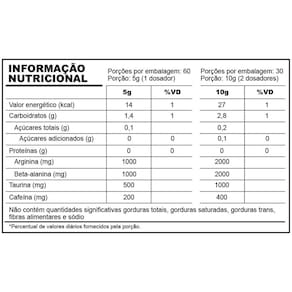 Cloridrato De L-Arginina, Beta-Alanina, Maltodextrina, Taurina, Beterraba Em Pó, Melancia Em Pó, Cafeína, Extrato De Laranja Amarga, Acidulante Ácido Cítrico, Antiumectante Dióxido De Silício E Fosfato Tricálcico, Aromatizante Idêntico Ao Natural, Edulcorante Sucralose E Acessulfame De Potássio, Corante.