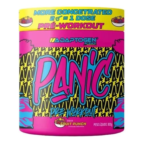 Panic 300g pré treino adaptogen pré workout. O panic pre workout fruit punch é um suplemento pré-treino projetado para fornecer energia intensa e foco mental durante os treinos. Combinando uma variedade de ingredientes cuidadosamente selecionados, essa fórmula busca melhorar o desempenho atlético e maximizar os resultados dos exercícios. Ingredientes: arginina,aroma idêntico ao natural de maçã verde,cafeína,creatina,edulcorante sucralose,fosfato tricálcico,maltodextrina,taurina,tirosina,aroma de mascarante,beta alanina,corantes amarelo 5 e zul 1,ácido cítrico